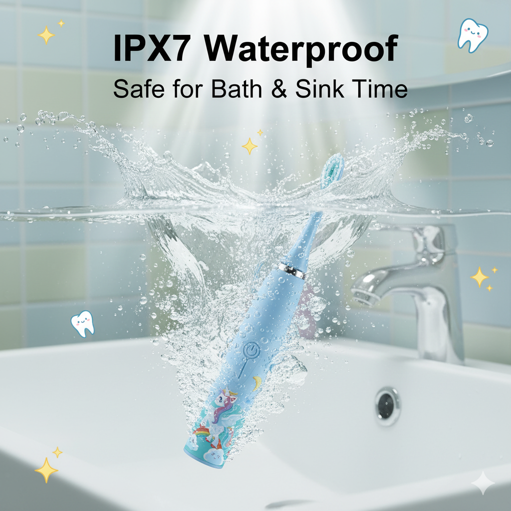 Made with IPX7 waterproof protection, kids can brush safely in the bath or shower β no worries. A smart 2-minute timer with 30-second reminders helps kids brush correctly every time.